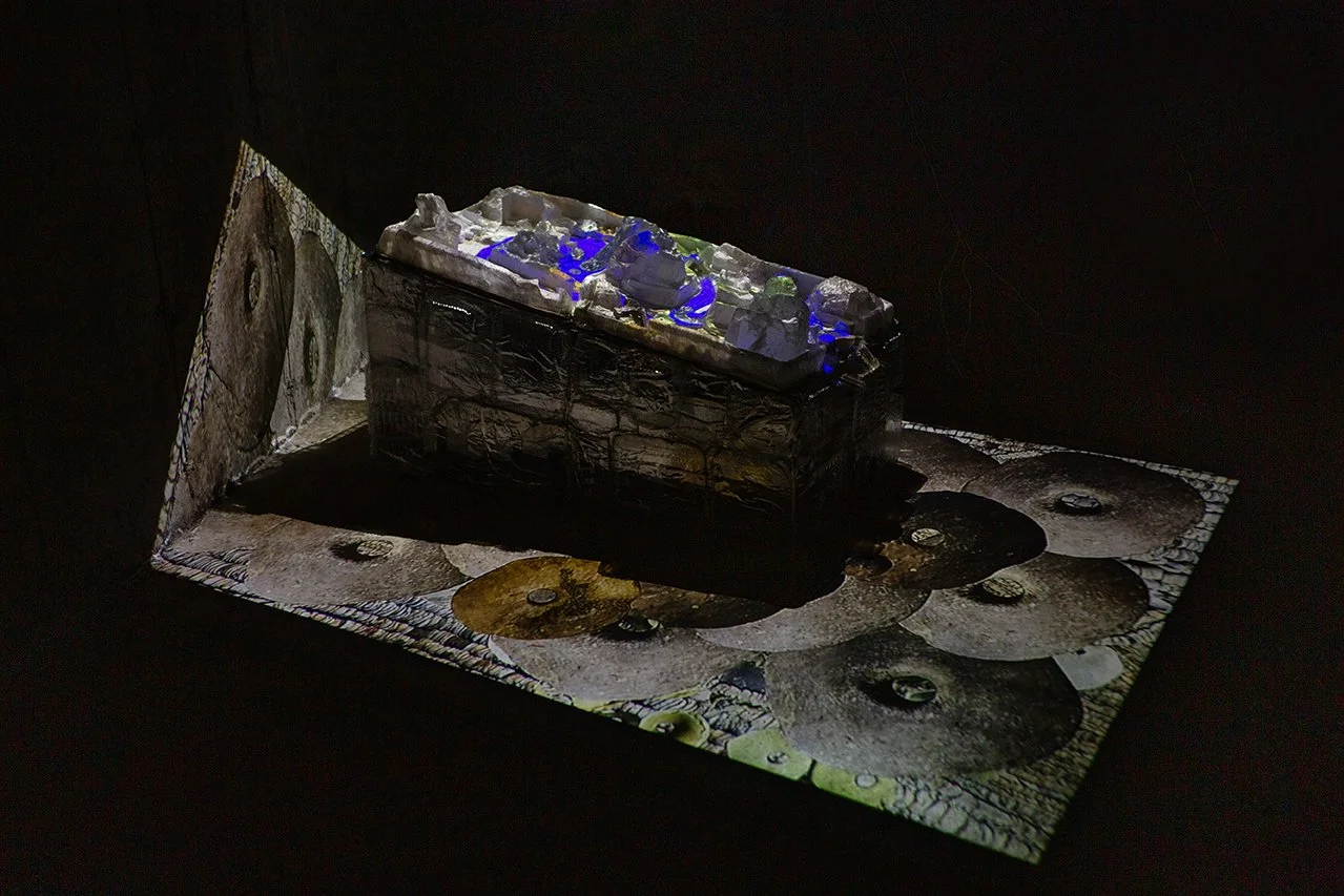 This projection mapped animated sculpture explores the relationship of value and the environment by framing currencies from antiquity traveling through a discarded to-go plastic theme park ride. A passageway of water appears on the glowing sculpture and the current pulls various forms of money along the ride. The ride includes 12 chapters, or loops, of currency – including coins from Ancient Rome, giant stones from the Island of Yap, Cowrie Shells from Egypt, and glass beads from Africa. The projection mapping layers animations on three levels, showing a macro view of the currency on the ride and a micro detailed view projected on the ground around the sculpture. As we continue down this digital, plastic ride with intangible cash flow in today’s economic climate, “Change for A Ride” is a reminder of the origins of measuring value; questioning how we equate what’s valuable and its connection with the land.