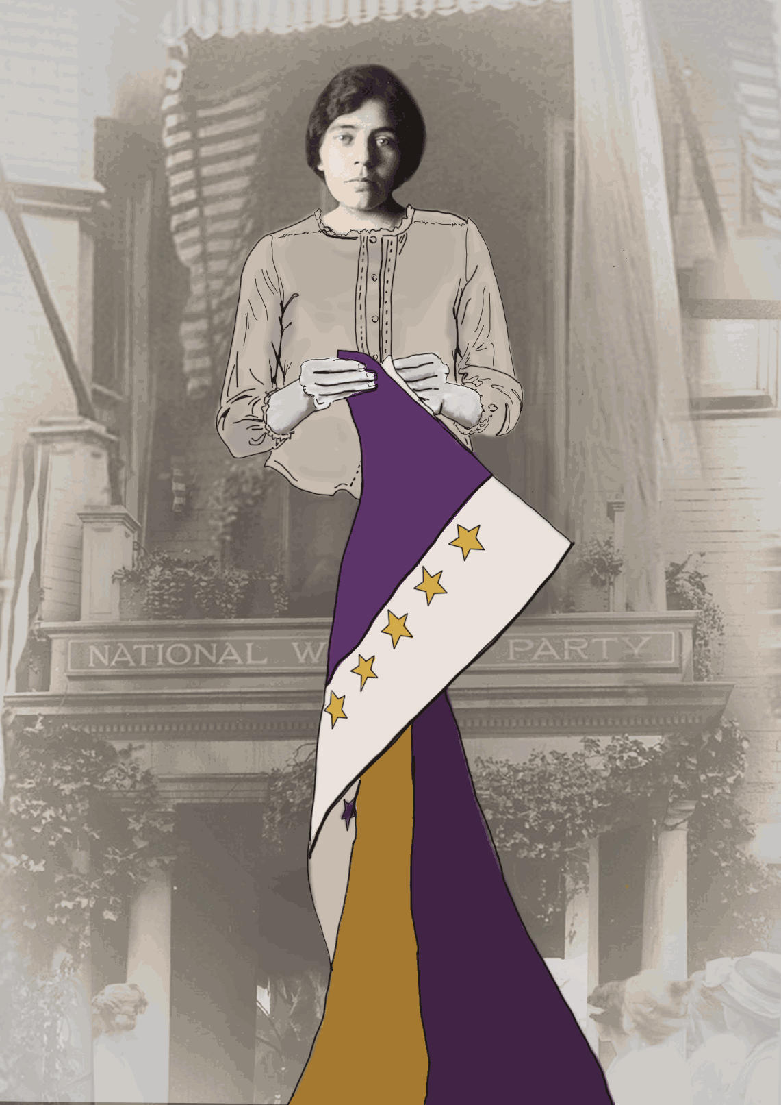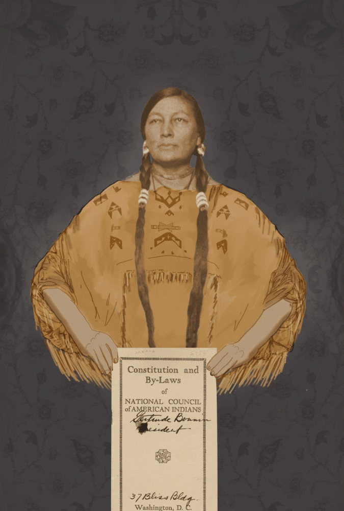 Zitkála-Šá was a writer, musician and suffragist who co-founded the National Council of American Indians. She is holding its constitution, and signed her second name, Gertrude Bonnin, as president. The matriarchal political power of women within indigenous cultures was a source of inspiration for suffragists. Zitkála-Šá was often invited to speak at suffrage conferences and join parades. And yet, she could not vote when the 19th Amendment was passed. Zitkála-Šá played an essential role in passing the 1924 Indian Citizenship Act. The right to vote, however, was not guaranteed nationwide. Unjust restrictions of literacy tests and poll taxes were in place, until the Voting Rights Act of 1965. Zitkála-Šá helped compose the first Native American opera, wrote extensively, gave public speeches, and continued to serve as president of the National Council of American Indians until her passing in 1938.